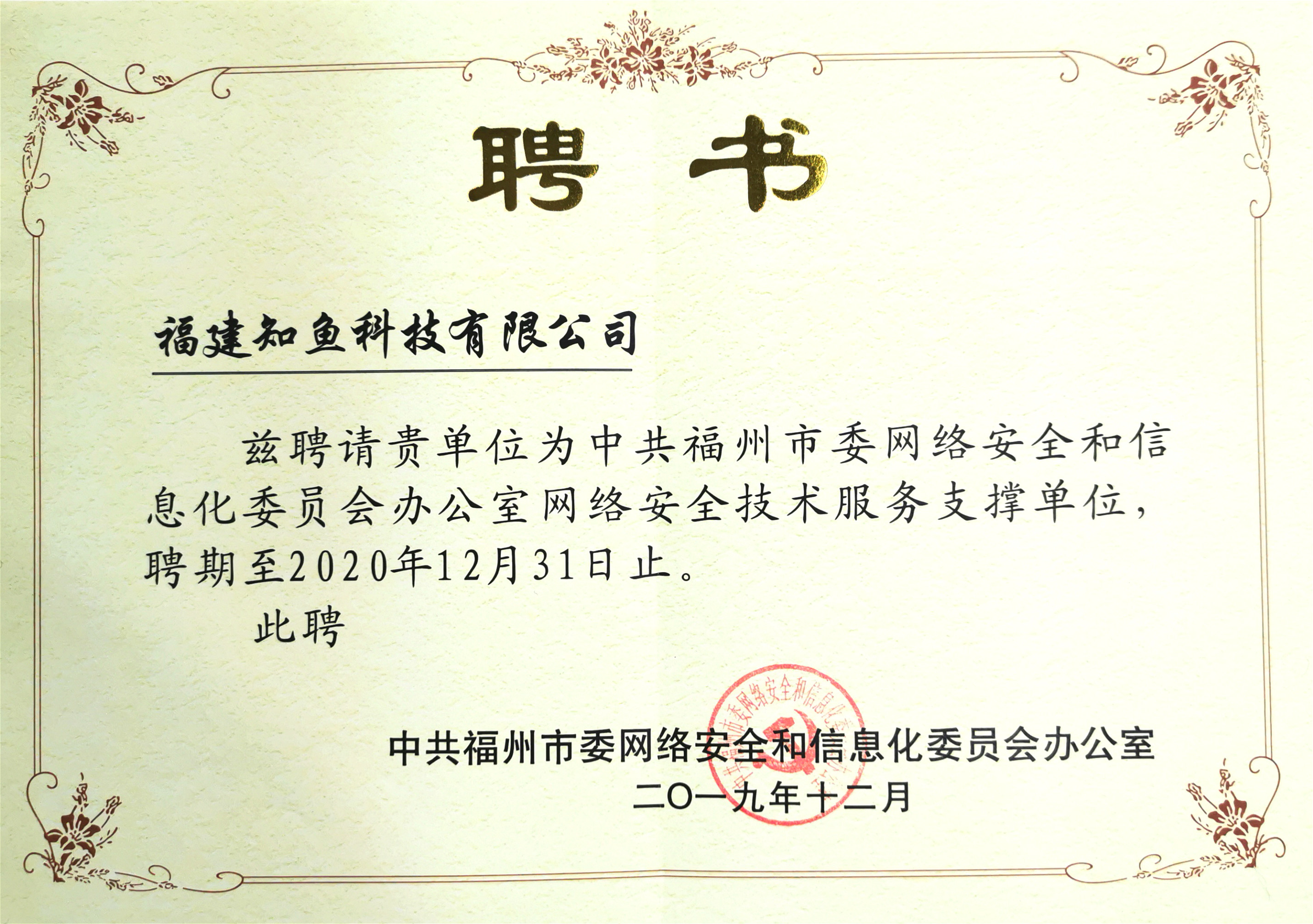 2019年12月,憑借網絡安全領域的技術優(yōu)勢,知魚科技受聘為福州市委網信辦首批網絡安全技術支撐單位,為全市多領域提供網絡安全測評、網絡空間測繪、入侵檢測、安全防護等在內的網絡安全綜合解決方案,為公共網絡安全保駕護航。